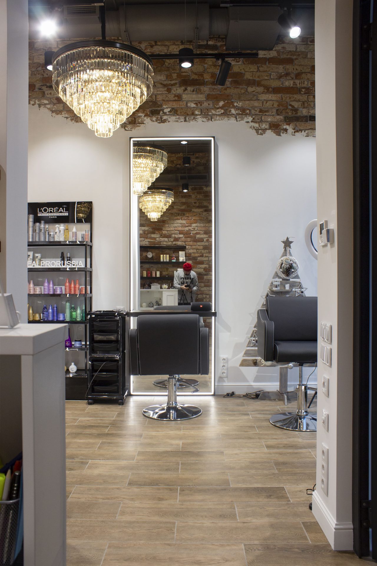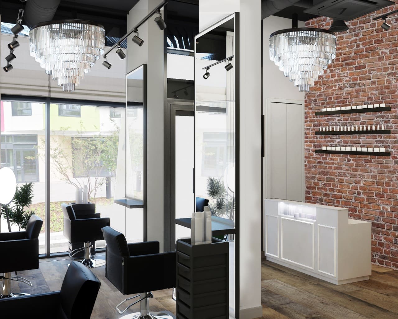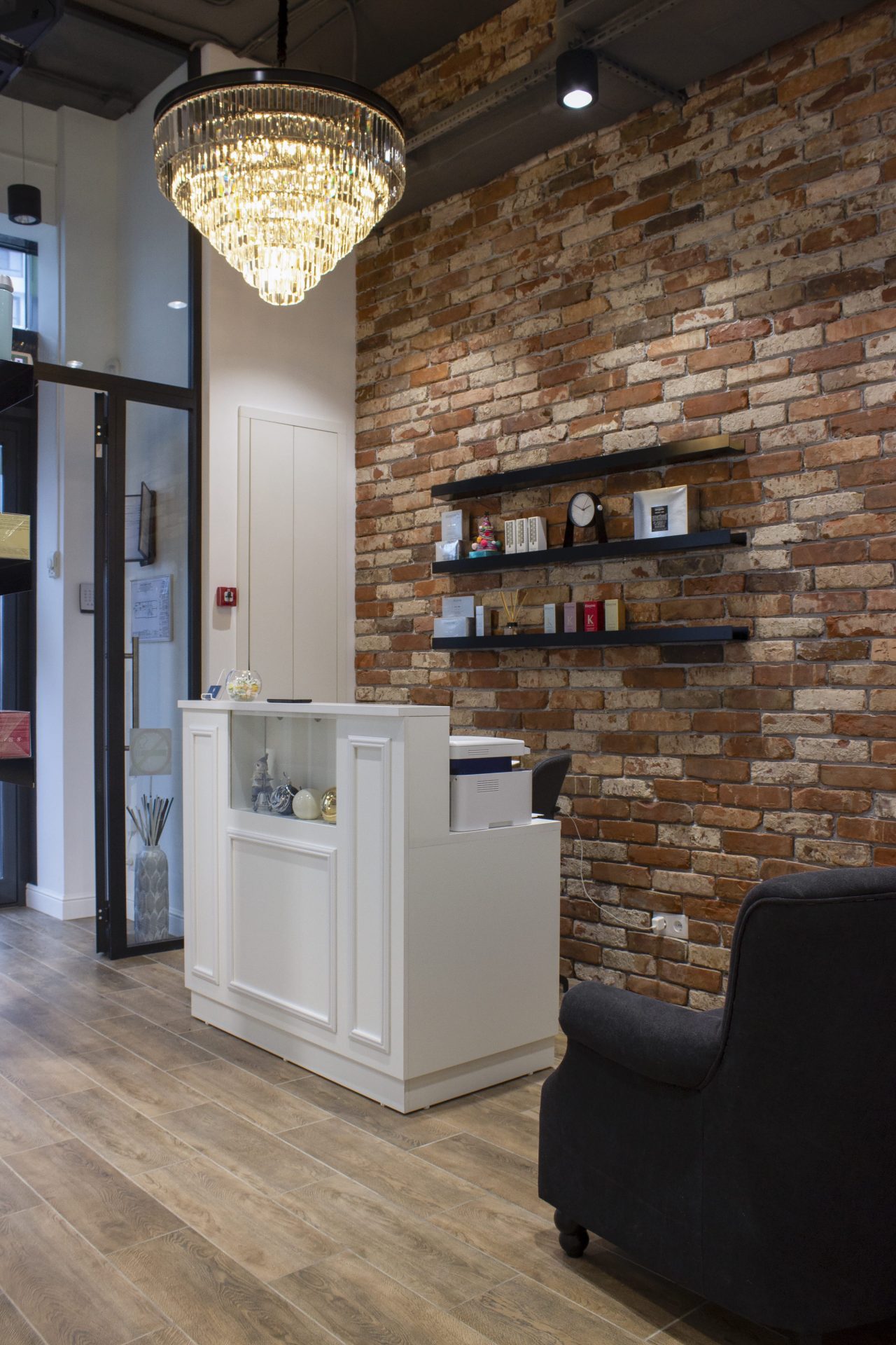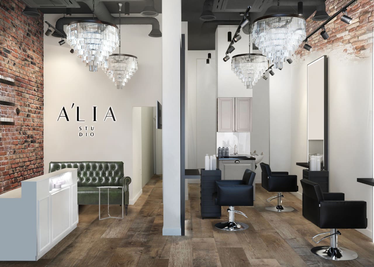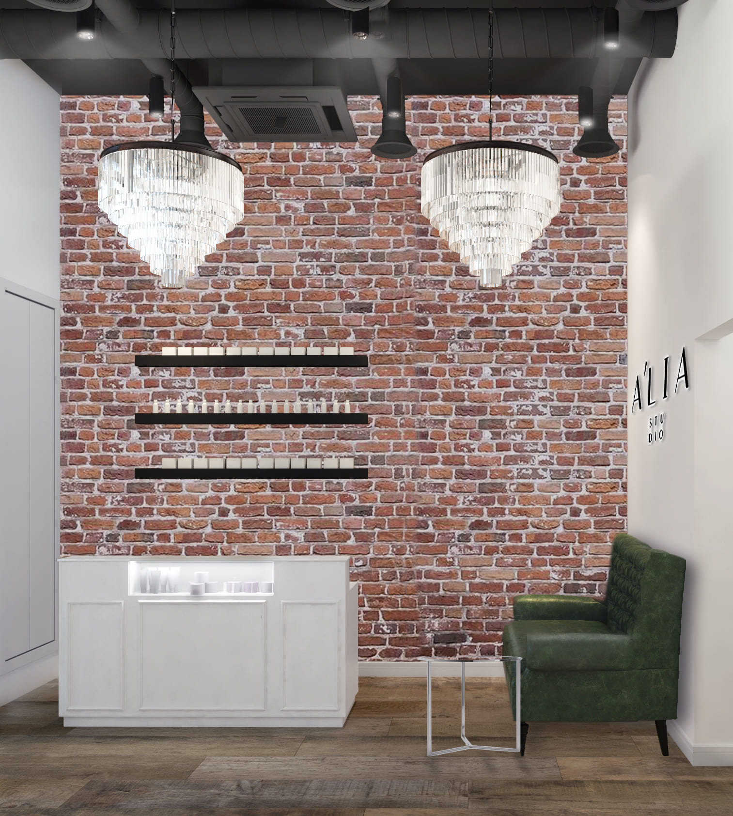 Дизайн помещения салона красоты «ALIA» представляет собой стильное и современное сочетание лофта и минимализма. Интерьер спроектирован таким образом, чтобы создать одновременно профессиональную и уютную атмосферу для клиентов. Белые гладкие стены и элегантная белая стойка ресепшн с молдингами контрастируют с грубой красной кирпичной кладкой, что является определяющей чертой стиля лофт. Используется нейтральная палитра с акцентами. Доминируют белый и черный цвета (название студии, светильники, кресло для ожидания, полки). Теплый оттенок напольного покрытия, имитирующего дерево, добавляет пространству уюта и тепла.