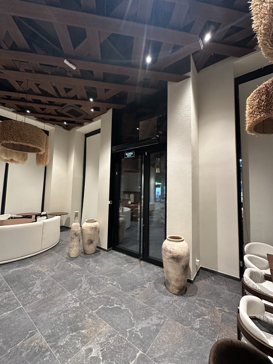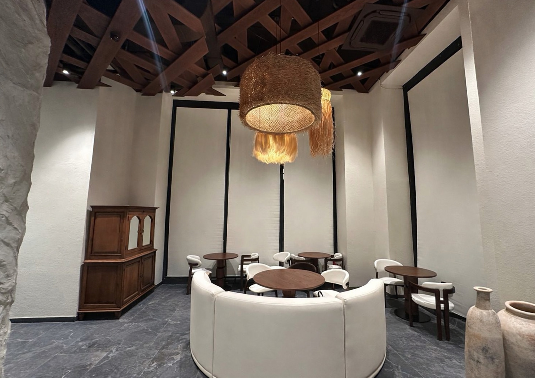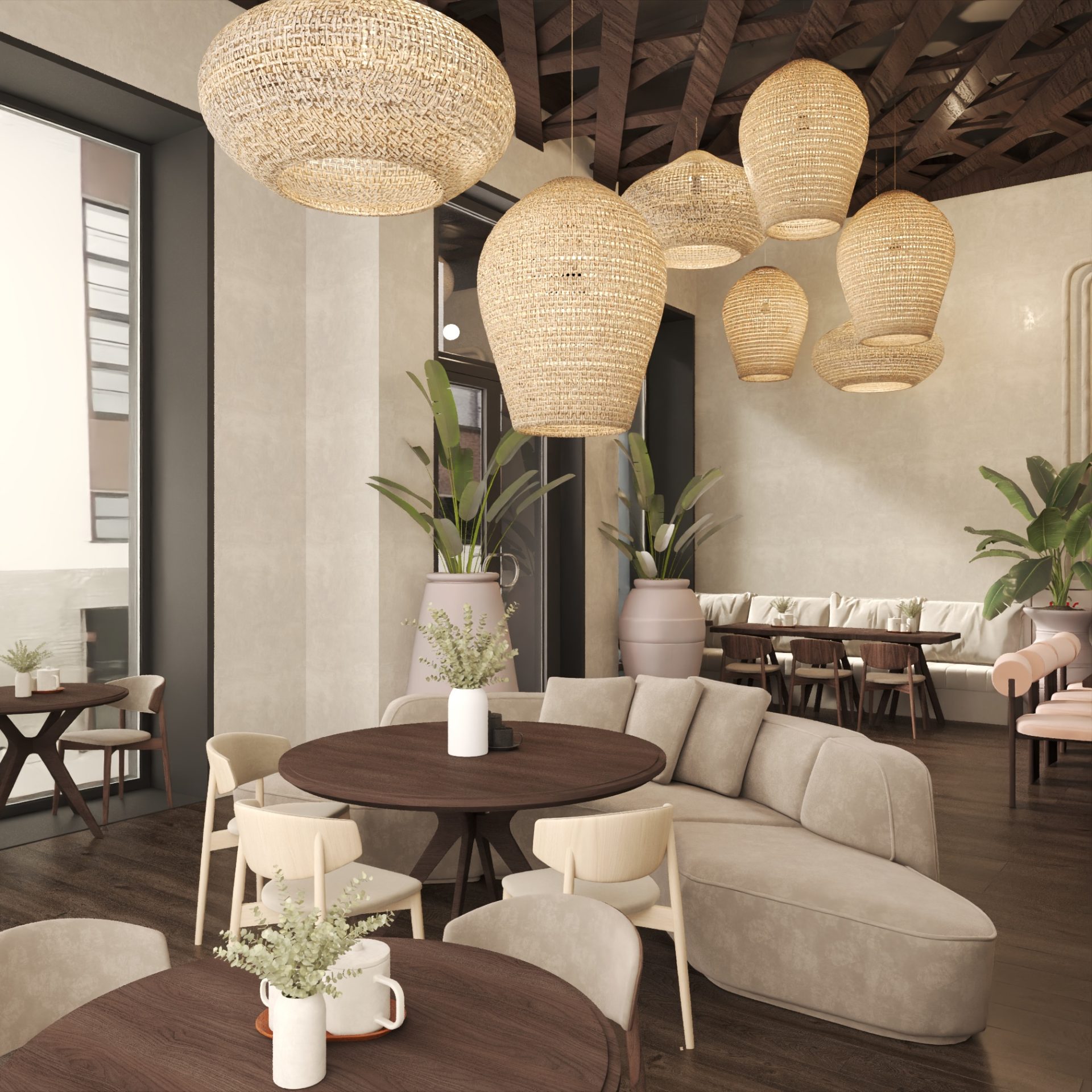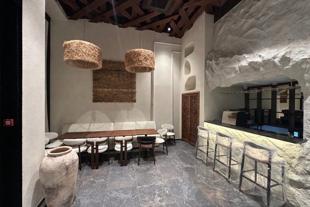 Дизайн интерьера ресторана «БАНЕГА» был выполнен в популярном сейчас рустикальном стиле. Этот стиль характеризуется использованием натуральных материалов, таких как необработанный камень, дерево и плетеные элементы, создавая уютную и естественную атмосферу.