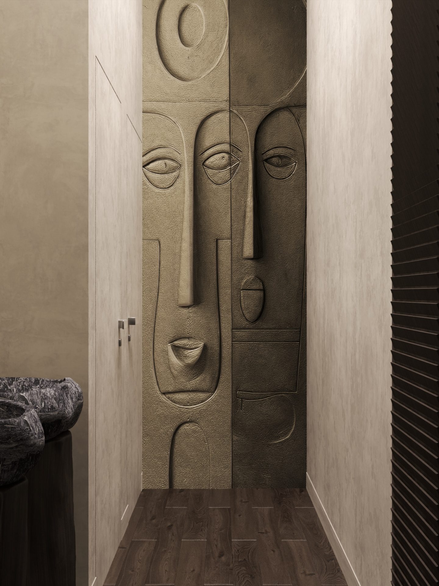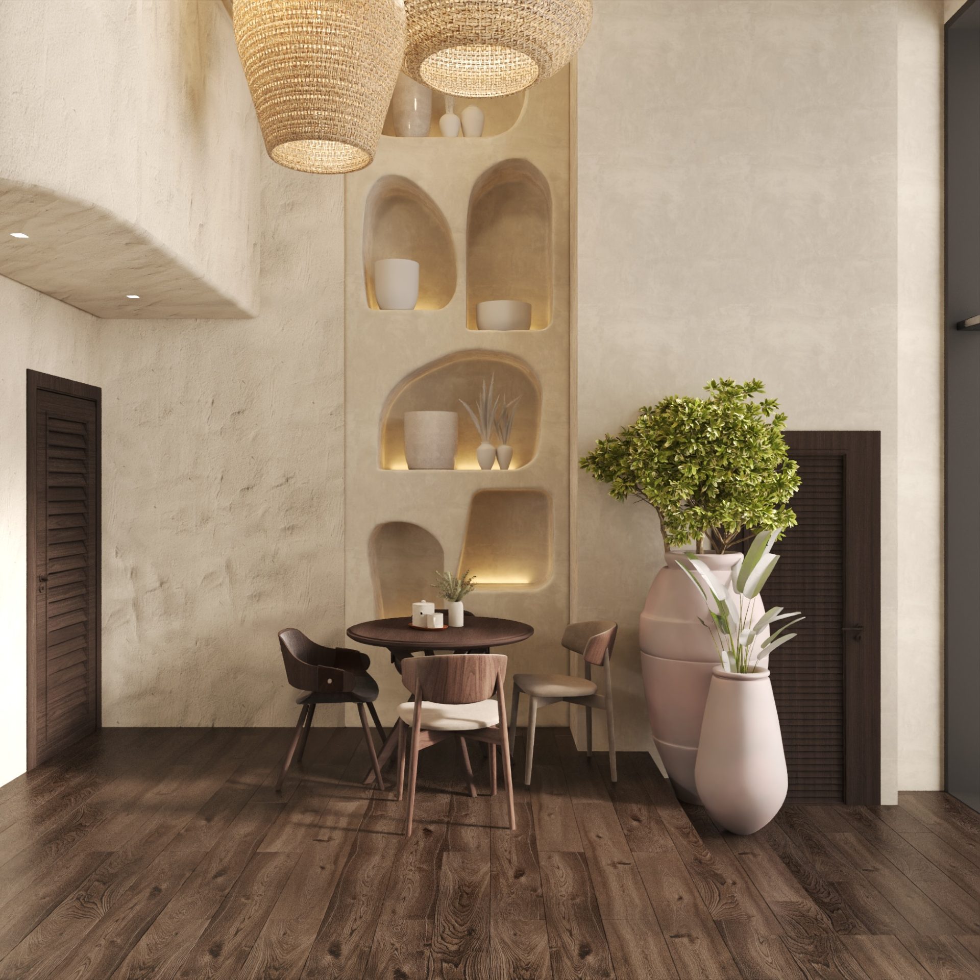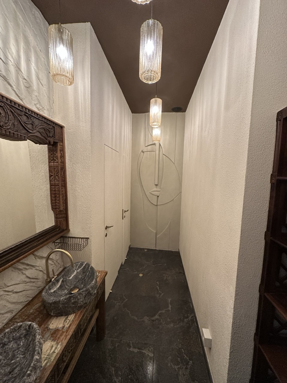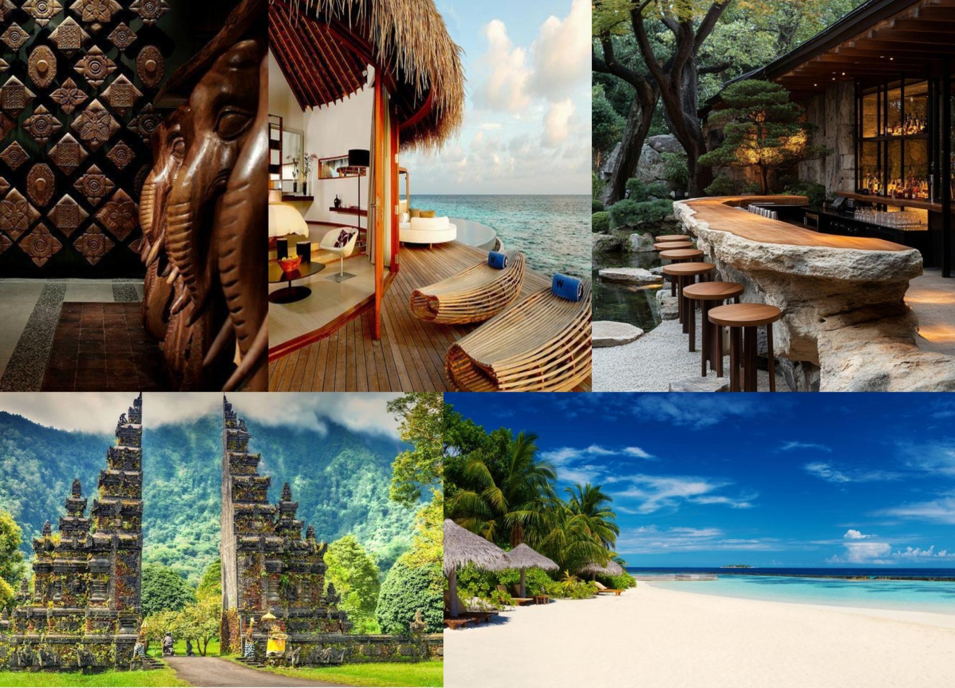 В дизайне помещения преобладают белая текстурированная штукатурка или камень на стене и массивная деревянная мебель. Потолок украшен видимыми деревянными балками, что является ключевой чертой рустикального стиля. Дизайнеры вдохновлялись природой Мальдив и Индонезии.